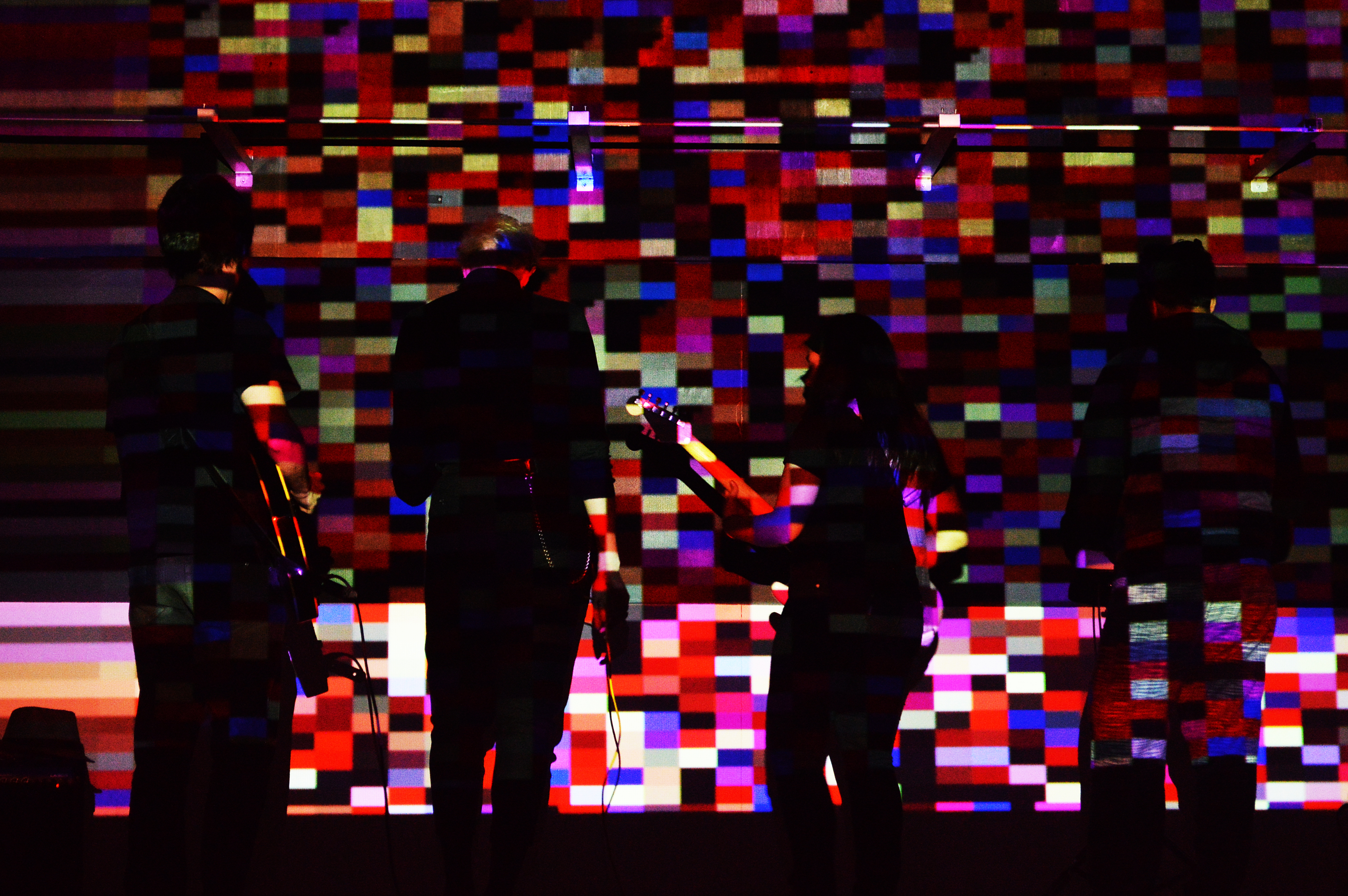 Evento audiovisual para a disciplina Introdução às práticas audiovisuais, ministrado por Patrícia Moran. Foi desenvolvido [via processing] um programa responsivo à música e sujeito a variáveis [cor, velocidade, entre outros] controláveis por qualquer espectador. O trabalho foi apresentado numa sala pequena, com a performance de uma banda iluminada por três projetores mostrando o programa em ação.